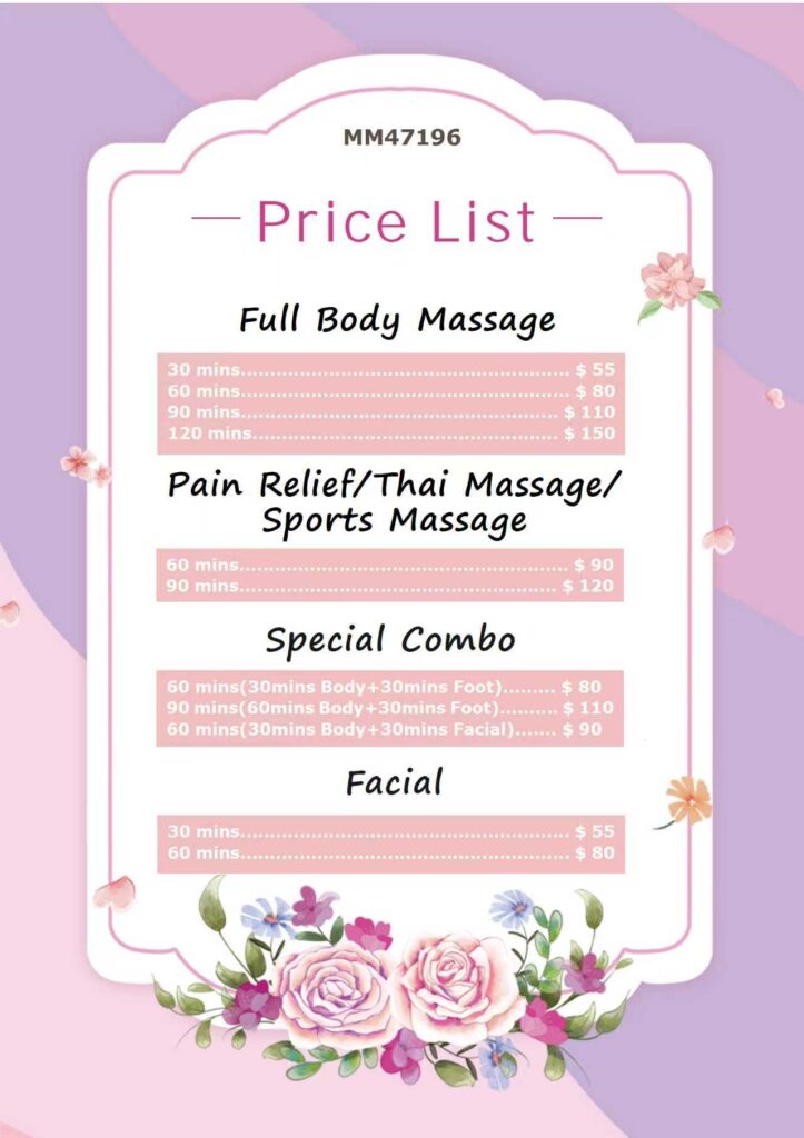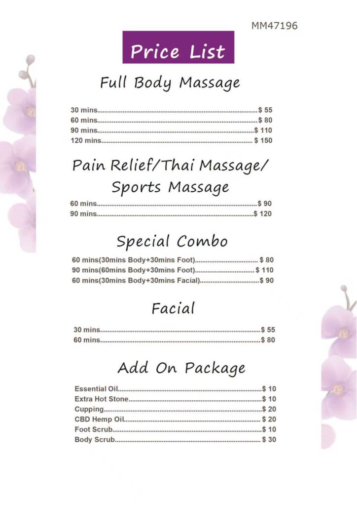 Our services include Deep Tissue, Swedish, Sports, Thai Massage, Reflexology, Hot Stone, Facial treatments, Essential Oil therapy, Scrubs, Cupping, and Combination massages.